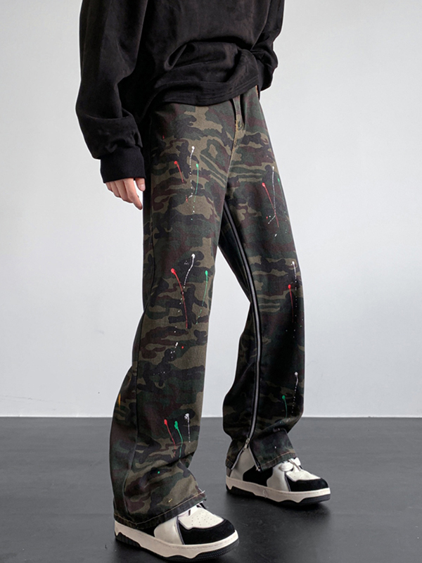 Men’s Camo Splash Ink Print Side Zip Up Loose Jeans
