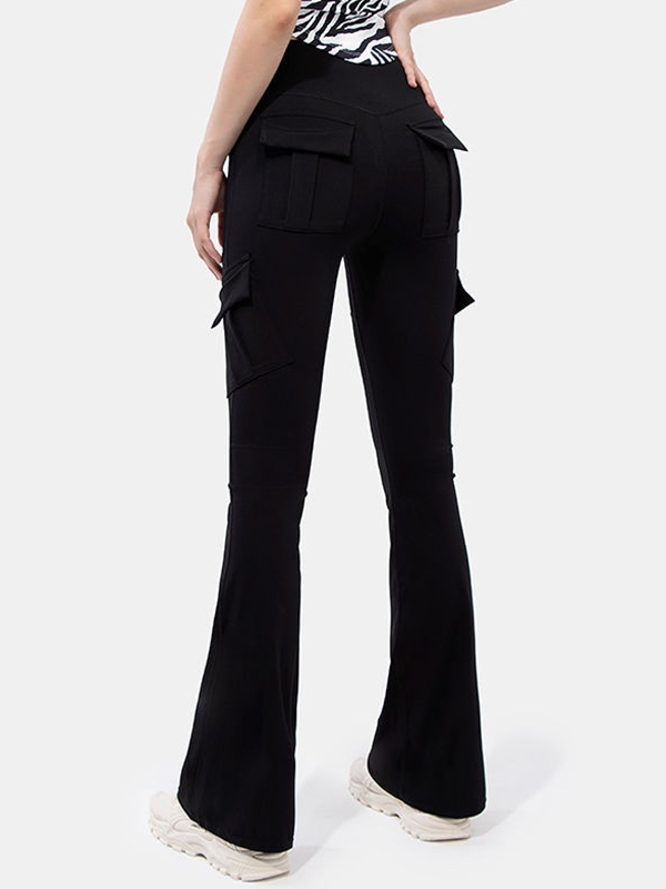 Solid Multi Pocket High Rise Flare Leg Pants