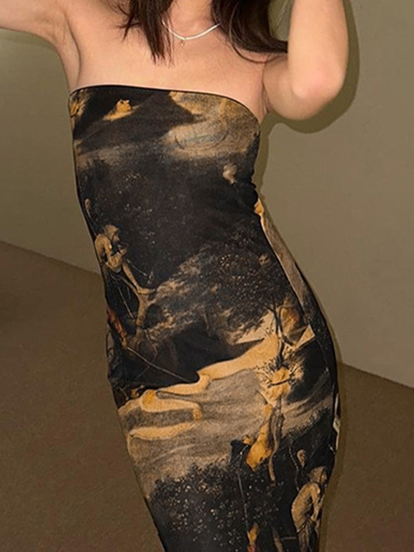 Vintage Painting Print Bandeau Slim Midi Dress