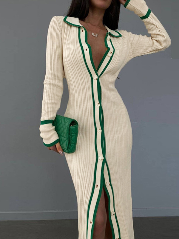 Contrast Color Trim Splice Lapel Neck Slim Midi Dress