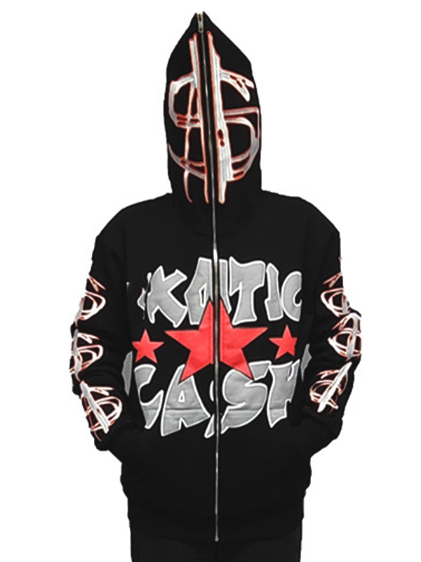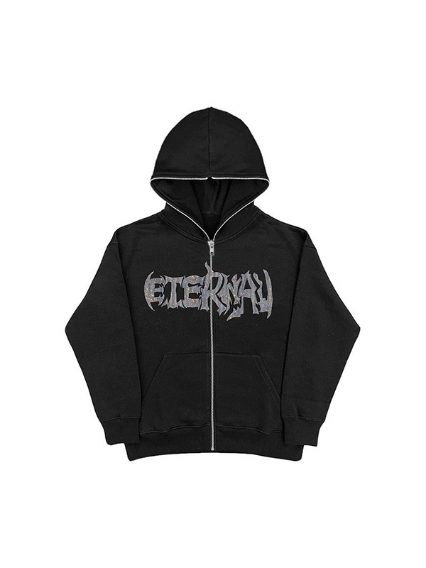Men’s Rhinestone Letter Skull Black Zip Up Hoodie