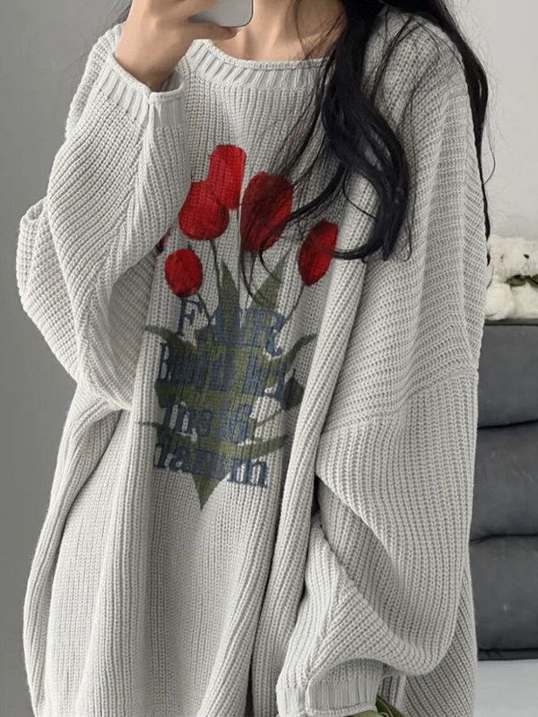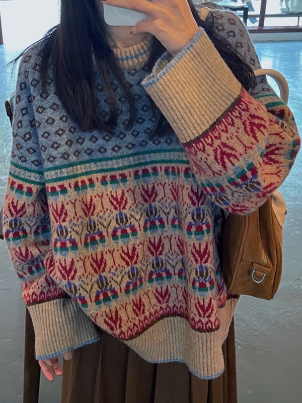 Cross Print Button Crewneck Slim Long Sleeve Knits