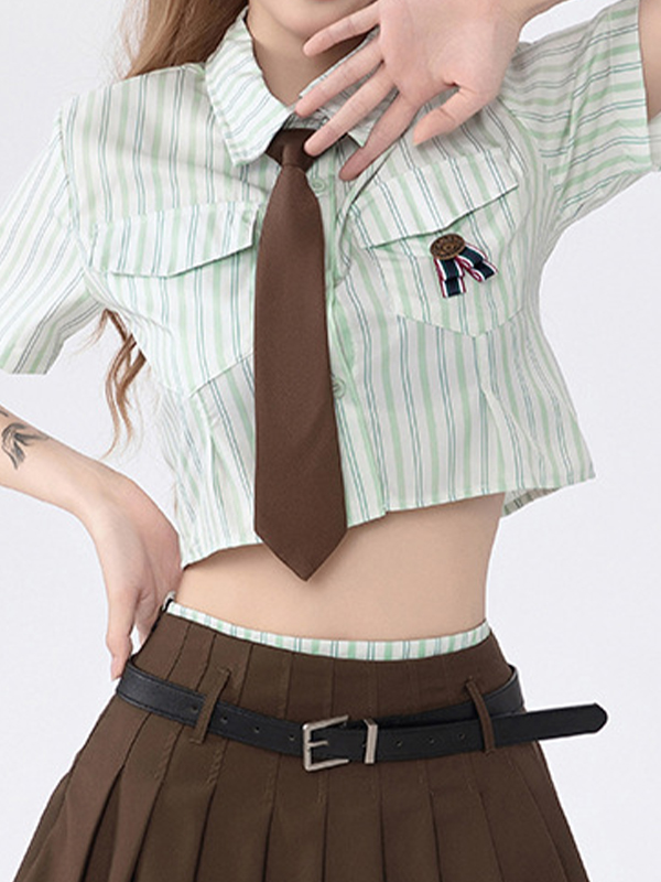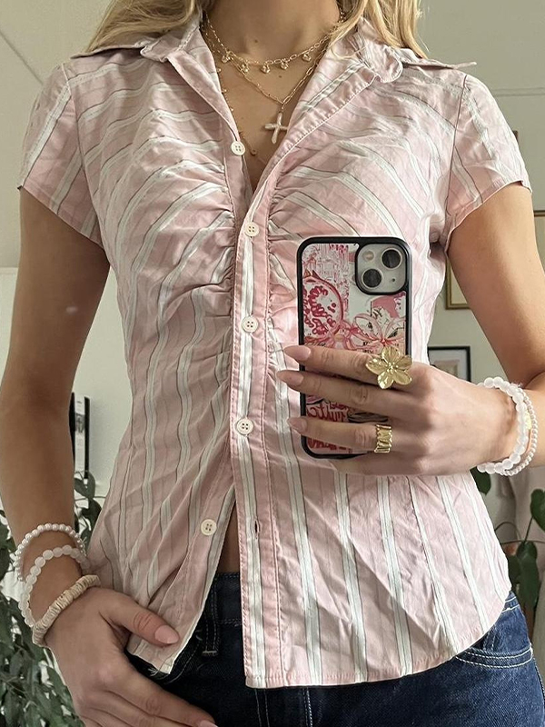 Stripe Splice Polo Neck Long Sleeve Blouse