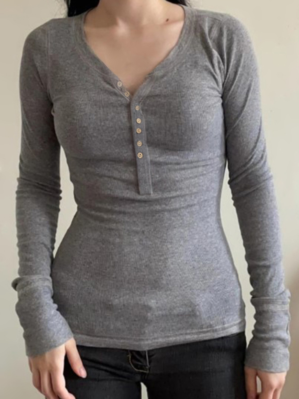 Solid Ribbed Breasted Long Sleeve Tee