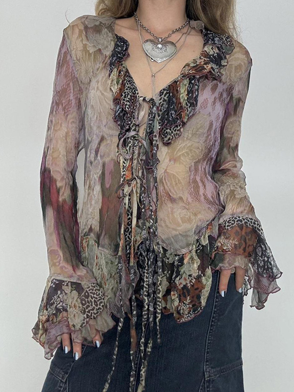 V-Neck Lace-Up Bell Sleeves Long Sleeve