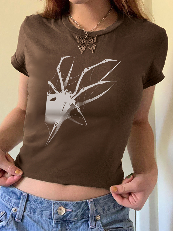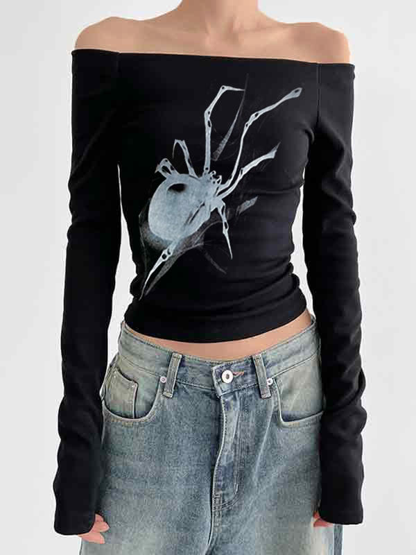 Spider Print Off Shoulder Slim Long Sleeve Tee