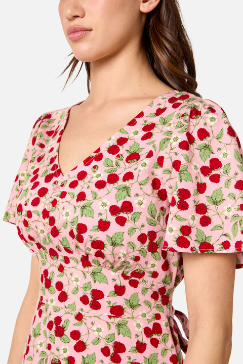 Tauchen Sie ein in die süße Nostalgie der 90er mit dem Himbeer-Minikleid von Princess Highway. Dieses Teekleid mit verspieltem Print aus saftigen Himbeeren und zarten Blüten auf hellrosa Grund vereint Vintage-Charme mit einer schmeichelhaften Empire-Silhouette. Die fließenden kurzen Ärmel und die dekorativen Knöpfe machen es zum perfekten Begleiter für sonnige Spaziergänge und unbeschwerte Sommermomente.