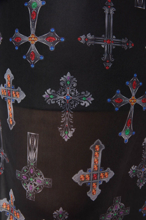 Tauchen Sie ein in eine Welt, in der gotischer Charme auf märchenhafte Verspieltheit trifft – mit dem Mesh-Kleid von Dangerfield. Dieses Ensemble besticht durch zarte Spaghettiträger, die den Blick auf einen gewagten, tiefen Ausschnitt lenken, der Ihre Lieblingskette perfekt in Szene setzt. Die figurbetonte Silhouette schmiegt sich an Ihre Kurven und kreiert eine bezaubernde und geheimnisvolle Eleganz. Ein raffinierter Layering-Look: Das transparente, mittellange Oberkleid gibt den Blick auf das kürzere Futter frei und spielt so ein verführerisches Versteckspiel mit dem Betrachter. Verziert mit einem Allover-Print mit Kreuzen, weckt dieses Kleid die Neugier und regt zum Gespräch an – die perfekte Wahl für Vernissagen oder Mitternachtspartys unter dem Sternenhimmel. Gefertigt aus fließendem Polyester, schwingt und schwingt es bei jedem Schritt sanft mit. Erhältlich in einem zeitlos mystischen Schwarz, ist es die perfekte Wahl, um Zauber zu wirken oder einfach Herzen zu erobern.