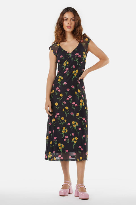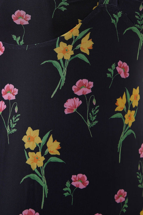 Mit dem floralen Netz-Kleid von Princess Highway schlüpfen Sie in die 90er-Jahre und lassen die Nostalgie zwischen Narzissen und Nelken wieder aufleben. Dieses Kleid ist eine poetische Hommage an das Jahrzehnt: Das Oberteil im Empire-Stil betont elegant die Taille und geht fließend in einen leicht taillierten Rock über. Kurze Flügelärmel umspielen Ihre Schultern und verleihen dem Kleid einen Hauch von Verspieltheit und Freiheit. Der V-Ausschnitt bietet Raum für Eleganz und Sinnlichkeit und lässt einen verspielten Blick auf das Dekolleté erahnen. Gefertigt aus einem Polyester-Elastan-Gemisch, vereint dieses Kleid Komfort und Langlebigkeit und sorgt dafür, dass Ihr Retro-Look auch in Zukunft noch Freude bereitet. In Schwarz gehalten, bildet es einen vielseitigen Hintergrund, der das florale Muster perfekt zur Geltung bringt – ideal für Kaffeetreffen, entspannte Stadtbummel oder gemütliche Abende mit Live-Poesie oder Musik in einer behaglichen Ecke.