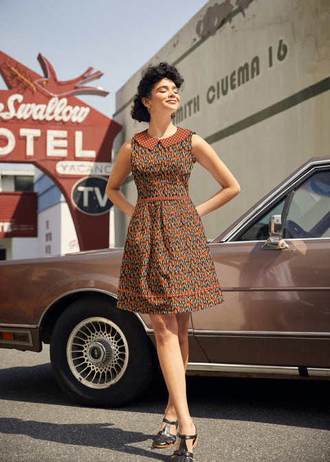 Dieses Retro-Kleid ist nicht nur witzig, sondern auch absolut praktisch und wird garantiert Ihr neues Lieblingsstück! Das Baumwollkleid im Stil der 60er-Jahre mit unserem „Mushroom“-Print besticht durch einen kontrastierenden Peter-Pan-Kragen, kontrastierende Paspeln, einen A-Linien-Rock mit Seitentaschen und einen Reißverschluss hinten.