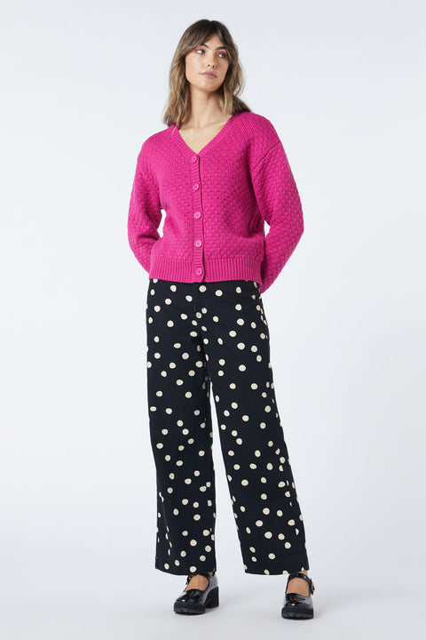 Kuscheln Sie sich in die gemütliche Langärmelige Strickjacke von Princess Highway ein – ein Kleidungsstück, das Wärme und einen Hauch von Verspieltheit vereint. Dieses strukturierte Schmuckstück mit seinem bezaubernden Blasenmuster ist die perfekte Wahl für kühle Wintermorgen und laue Abendspaziergänge. Der V-Ausschnitt und die durchgehende Knopfleiste verleihen ihm einen Hauch von klassischem Charme und laden zum mühelosen Kombinieren mit Ihren Lieblingsoberteilen ein. Die Strickjacke bietet eine bequeme Passform, die Körper und Arme sanft umschließt und Ihnen immer wieder ein wohliges Gefühl vermittelt. Sie ist aus einem Acryl-Baumwoll-Mischgarn liebevoll gewebt und garantiert so Wärme und Atmungsaktivität. Wählen Sie zwischen dem zarten Rosa oder dem ruhigen, tiefen Türkis, um Ihre Garderobe aufzufrischen. Diese Strickjacke ist ideal für einen entspannten Tag oder einen gemütlichen Abend zu Hause und ein vielseitiger Begleiter durch alle Jahreszeiten.