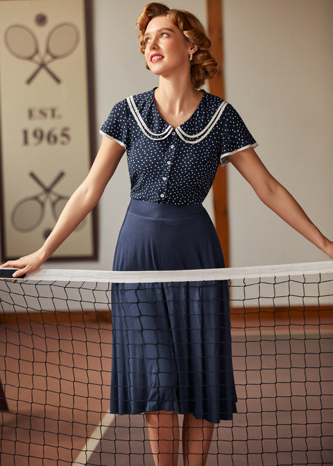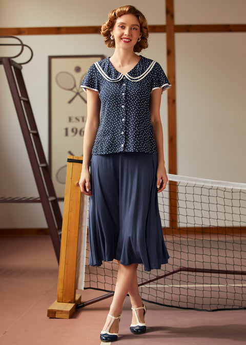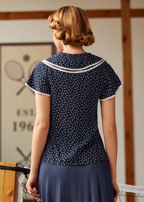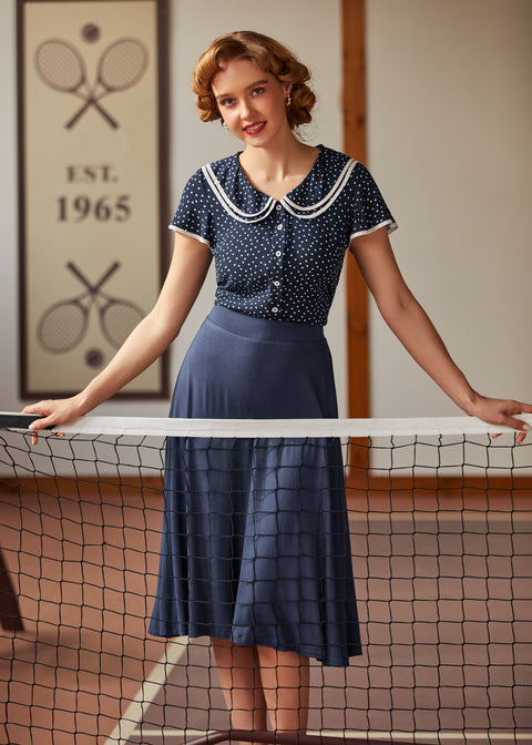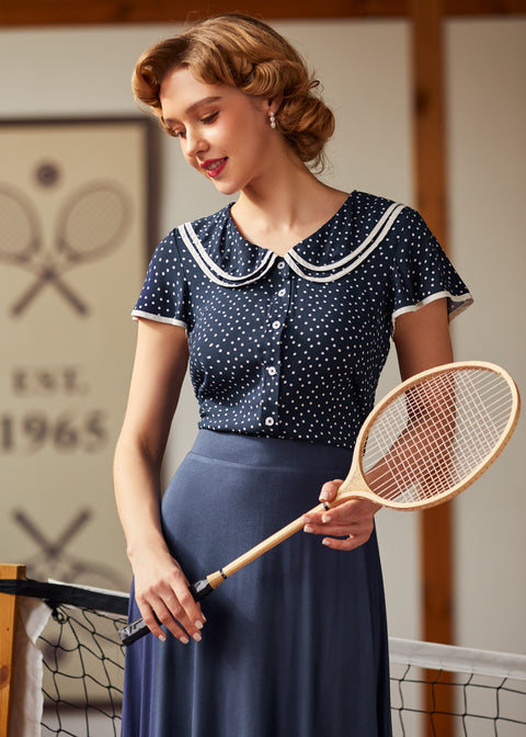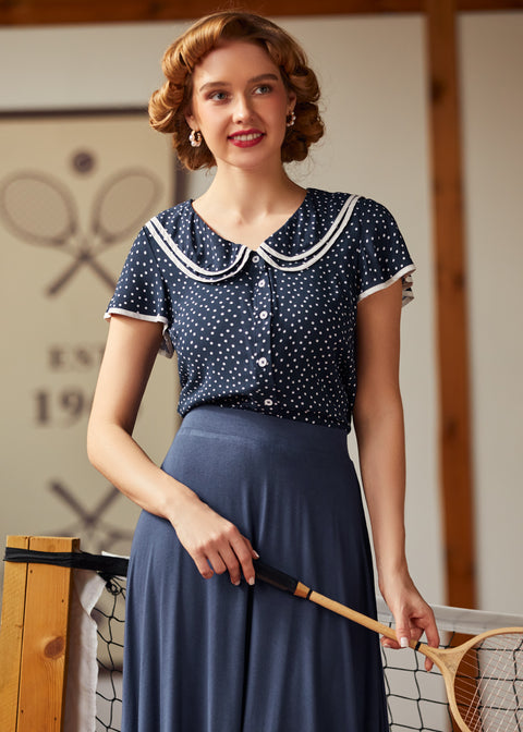 Tauchen Sie ein in einen märchenhaften Moment mit der Polka Dot Daydream Collar Blouse unserer ModCloth-Eigenmarke! Diese Bluse im Vintage-Stil besticht durch ein entzückendes marineblau-weißes Polka-Dot-Muster, flatternde kurze Ärmel und einen charmanten gestuften Peter-Pan-Kragen mit zarter Kontrastborte für einen Hauch von Verspieltheit. Ob zum Tanzen an sonnigen Nachmittagen oder als stilvolles Accessoire für Ihren Alltagslook – diese Bluse passt perfekt zu High-Waist-Jeans oder einem Swingrock und sorgt für zeitlose Eleganz. Egal, ob Sie im Garten Tee genießen oder durch eine malerische Stadt schlendern, dieses süße Oberteil lässt jeden Tag magisch wirken.