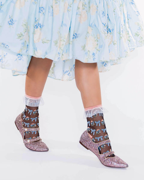 Inspiriert von der Bridgerton-Regency-Ära, besticht diese Rüschensocke mit pastellfarbenen Blumenmustern und süßen Schleifen auf schwarzem, transparentem Stoff. Ein weißes, transparentes Rüschenbündchen rundet den mädchenhaften Look ab. Passend zur transparenten Rüschensocke mit Blumenmuster – gönnen Sie sich und Ihrer besten Freundin jeweils eine! Einheitsgröße. Empfohlene Passform: US-Damenschuhgrößen 5,5–10. 200 Nadeln pro Zoll. Ausgefallen und elegant zugleich – keine albernen oder kindischen Muster. Hochwertige Qualität – strapazierfähig und mit angenehmem Stretchmaterial. Einzigartig – das perfekte Accessoire, um Ihren Outfits Individualität zu verleihen.