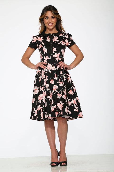 Das schwarze und pinkfarbene Swingkleid mit Blumenmuster von Orchid Bloom ist feminin und zugleich elegant. Die schmeichelhafte Swing-Silhouette verleiht ihm einen Hauch von Vintage-Eleganz und macht es perfekt für romantische Abende, Gartenpartys oder besondere Anlässe. Das Kleid ist aus einem weichen Baumwoll-Elasthan-Gemisch gefertigt und bietet genau die richtige Dehnbarkeit für optimalen Tragekomfort und eine schöne Silhouette. Mit einem Reißverschluss hinten und praktischen Seitentaschen ist diese Jacke ebenso funktional wie stylisch.