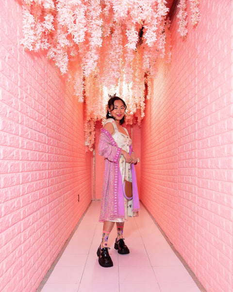 Rosa und lila Sonnenblumen machen diese Schmetterlingssocke zum Inbegriff des Frühlings. Verspielte Schmetterlinge krabbeln an den Füßen empor und verwandeln sich dabei teilweise in Sonnenblumen. Der hautfarbene, transparente Stoff sorgt für eine zarte und feminine Ausstrahlung.
