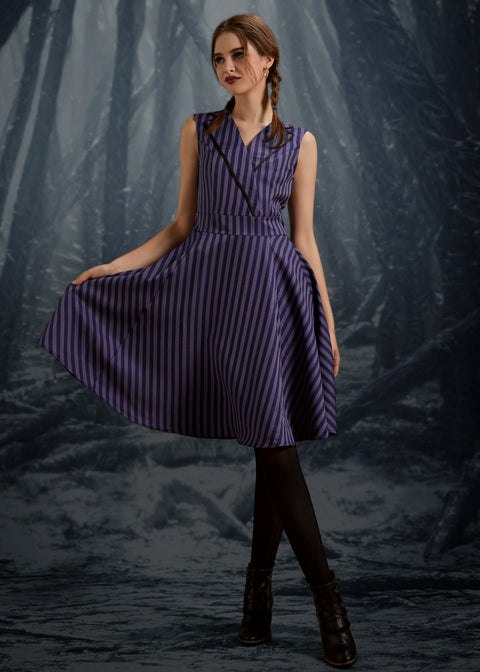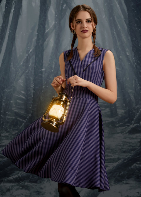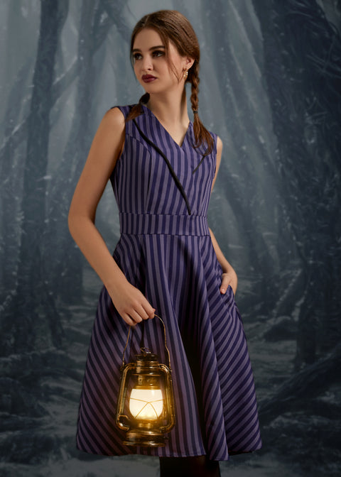 Setzen Sie ein modisches Statement mit dem schwarz-lila gestreiften Swingkleid von Orchid Bloom. Die markante Kombination aus schwarzen und lila Längsstreifen verleiht diesem Kleid im Vintage-Stil eine individuelle Note.