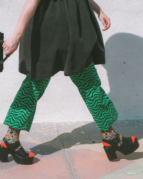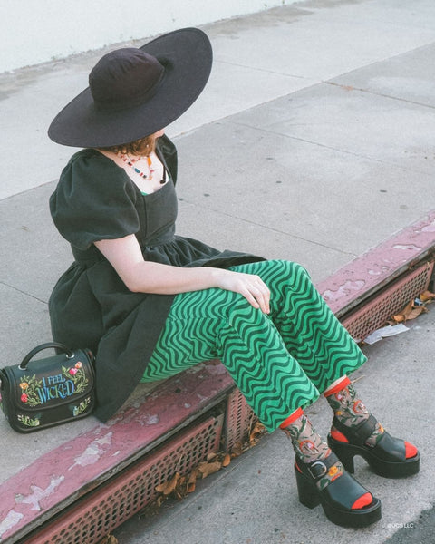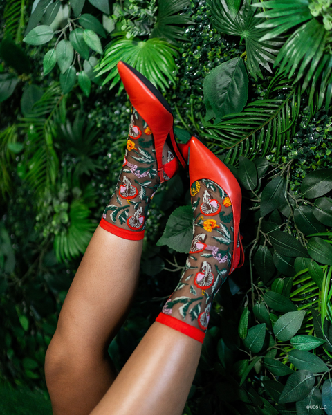 Tauchen Sie ein in die Welt von Elphaba mit der Elphaba Land Mushroom Black Sheer Socke. Das Design mit Wildpilzen und Mohnblumen in leuchtenden Rot-, Orange- und Gelbtönen ist eine Hommage an den Wald von Oz, Elphabas Heimat, und besticht durch seinen modernen Look auf schwarzem, transparentem Stoff. Ein mohnroter Bund, Zehen- und Fersenbereich setzen einen unerwarteten Farbakzent.