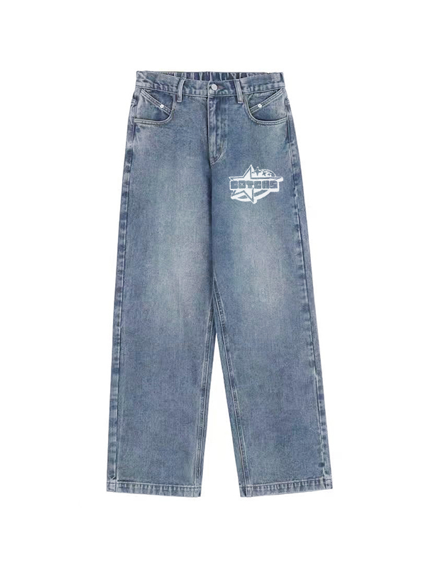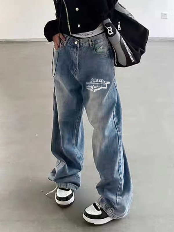 Print Embellished: The jeans feature a simple print embellishment, adding a unique touch to the overall design. The mopping design also adds to the casual and relaxed vibe of the jeans.
