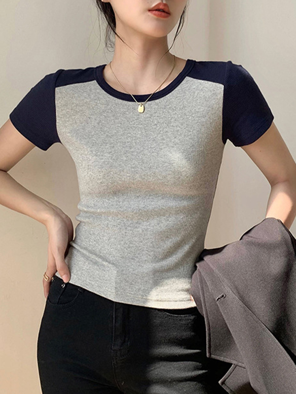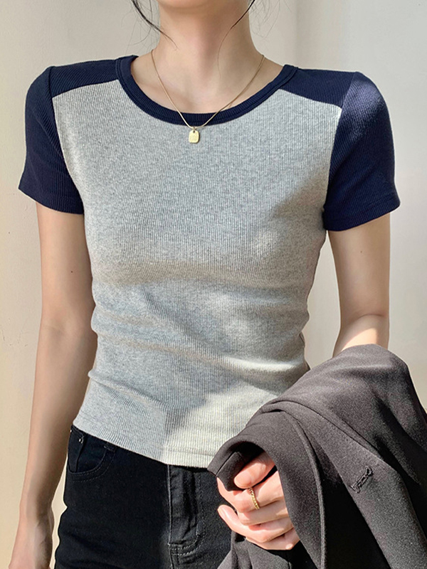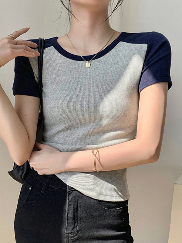 Contrast Color Stitching Crewneck Short Sleeve Knits