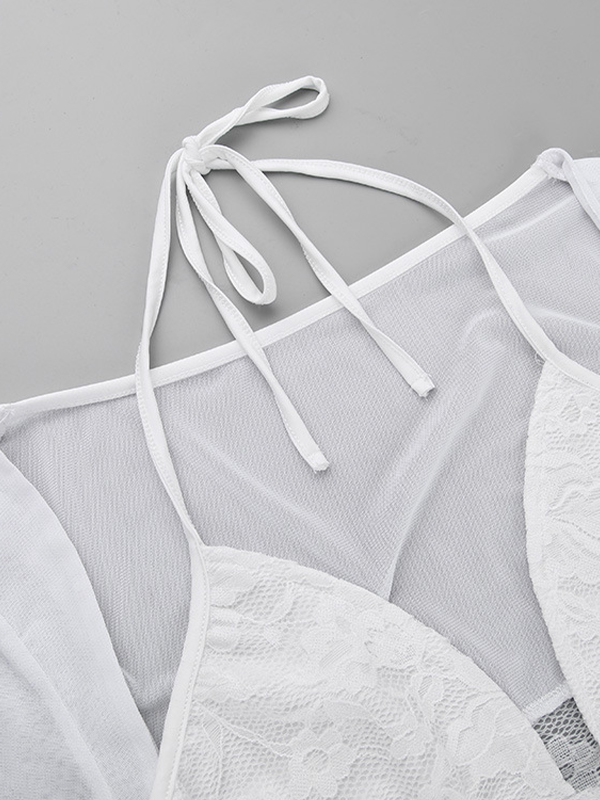 Halter Lace Splice Mesh Long Sleeve Two Piece