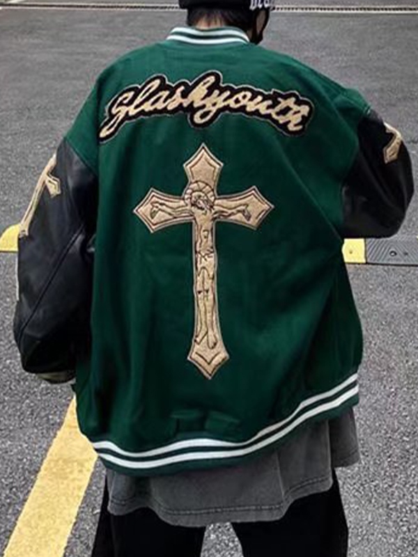Men’s Cross Embroidery Print PU Leather Patch Jacket